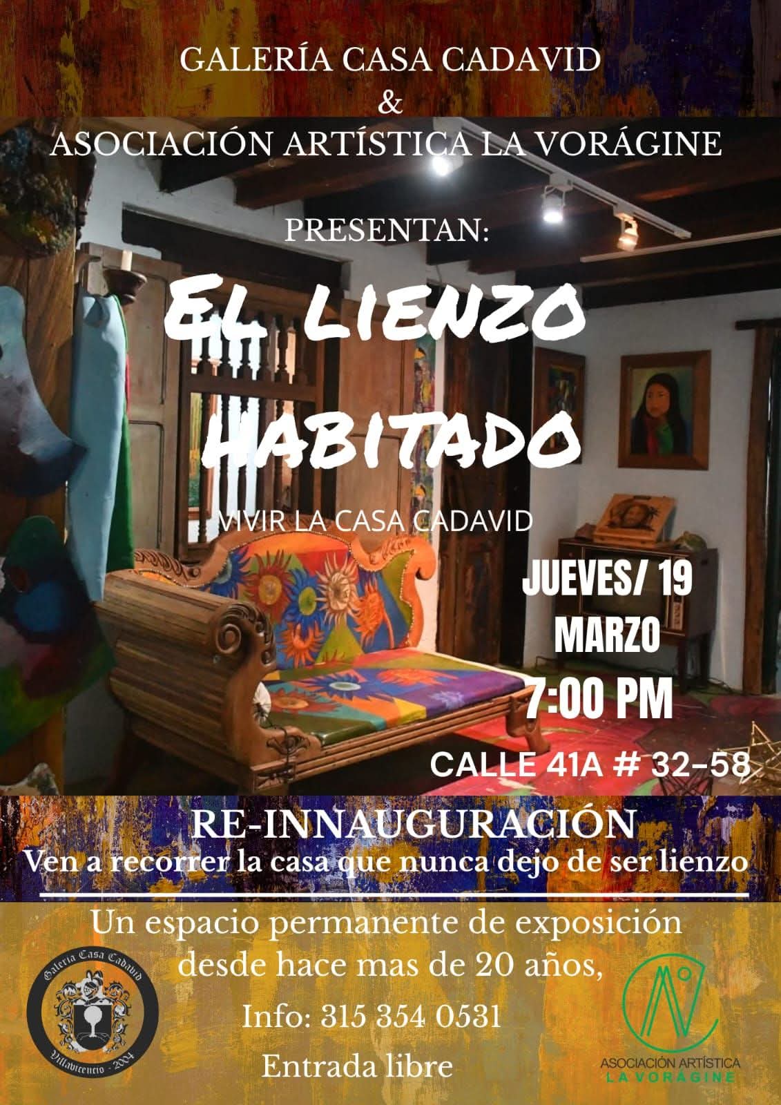 ¡RE-INAUGURACIÓN EN CASA CADAVID! No te pierdas la reapertura de nuestro espacio permanente de exposición. "El Lienzo Habitado" es una experiencia única en Villavicencio que tienes que vivir. Más de 20 años de trayectoria artística. Un ambiente lleno de color, historia y creatividad. ¡Entrada totalmente libre!